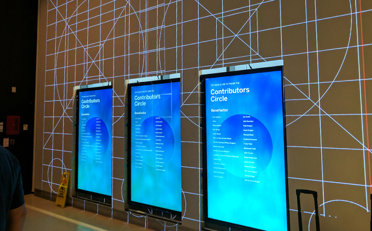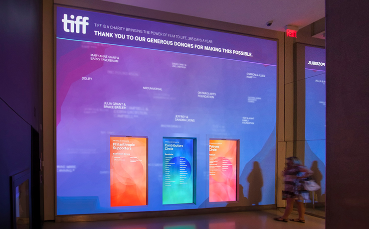 A larger-than-life – spanning 24’ wide x 20’ high, dynamic donor recognition system for TIFF’s headquarters in the heart of downtown Toronto. Deriving inspiration from contemporary art.