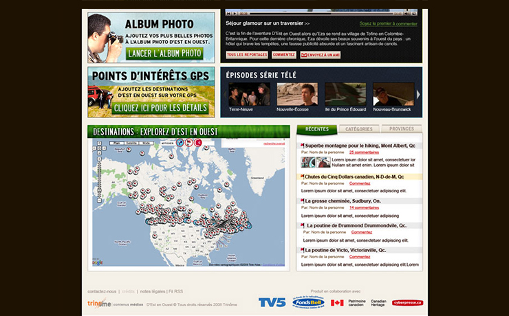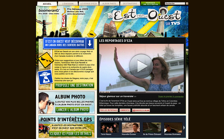 French Web and TV hybrid travel project where a web/reporter team traveling across Canada was tracked by GPS in real time and guided by Internet users cross Canada in search of all that is new and different in the country discovers a Canada off the beaten path the best destinations and topics to the TV host.